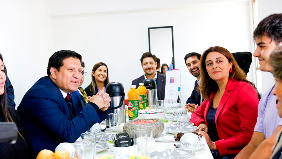 Un grupo de estudiantes residentes de departamentos fiscales compartieron un desayuno con la ministra de Bienes Nacionales, Marcela Sandoval; el delegado presidencial regional, Humberto Aqueveque, y el seremi de la cartera, César Concha.