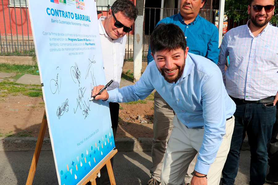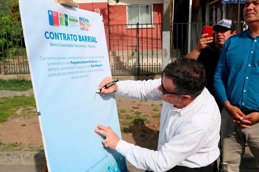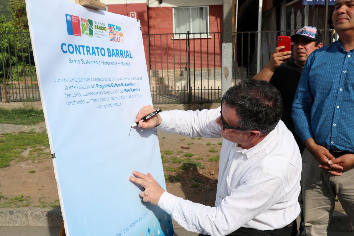 El pasado 9 de octubre se concretó la firma del contrato barrial del Programa Quiero mi Barrio en el sector nororiente de Machalí, instancia que marca el cierre de la etapa de diagnóstico y el comienzo de una nueva fase enfocada en la ejecución del Plan Maestro y del Plan de Gestión Social. La ceremonia fue encabezada por el seremi de Vivienda y Urbanismo, Luis Barboza Quintanilla; el seremi de Medio Ambiente, Diego Peñaloza; el alcalde de Machalí, Juan Carlos Abud; y el presidente del Consejo Vecinal de Desarrollo, César Morales, junto a vecinas, vecinos y representantes del sector público.