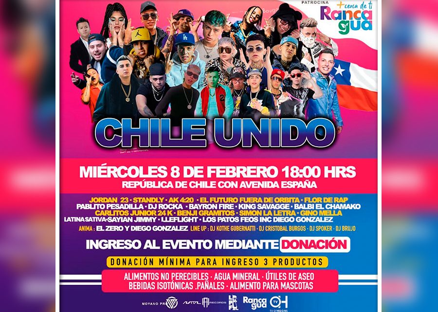En ese contexto, y con el objetivo de ir en apoyo a los miles de damnificados, Rancagua recibirá a grandes exponentes de la música urbana en “Chile Unido”, concierto solidario que se llevará a cabo este miércoles 8 de febrero desde las 18:00 horas en Av. República de Chile, en el frontis Complejo Deportivo Patricio Mekis. Jordan 23, Standly, AK 4:20, El Futuro Fuera de Órbita, Flor de Rap, Pablito Pesadilla, DJ Rocka, Bayron Fire, King Savagge, Balbi El Chamako, Carlitos Junior 24K, Benji Gramitos, Simón La Letra, Gino Mella, Sayian Jimmy, Lleflight y mucho más serán parte de este evento, cuyo requisito para ingresar es realizar una donación mínima de tres productos: alimentos no perecibles, agua mineral, bebidas isotónicas, alimentos para mascotas, pañales y útiles de aseo. Antes de iniciar su feriado legal, el alcalde Juan Ramón Godoy señaló que “desde la Municipalidad de Rancagua queremos invitar a toda la comunidad rancagüina, y también de nuestras comunas vecinas, a sumarse al gran Concierto Solidario ‘Chile Unido’ que se realizará este miércoles desde las 18:00 horas en Av. República de Chile, en el frontis del Complejo Patricio Mekis, y que va en apoyo de las familias damnificadas con los incendios forestales en el sur del país”. Además, detalló que “para poder disfrutar de este evento y de la mejor música urbana, cada persona debe realizar una donación mínima de 3 productos, que pueden ser: alimentos no perecibles, agua mineral, bebidas isotónicas, útiles de aseo, pañales y alimentos para mascotas”