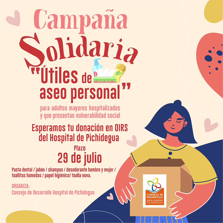 Con la finalidad de recolectar útiles de aseo para pacientes vulnerables. Por tercer año consecutivo, el Consejo de Desarrollo del Hospital Comunitario de Pichidegua y el establecimiento de salud se encuentran atendiendo las principales necesidades de pacientes más vulnerables hospitalizados, a través de una campaña solidaria que busca recolectar útiles de aseo para los usuarios que no cuentan con red de apoyo o con las condiciones económicas para cubrir estas necesidades.