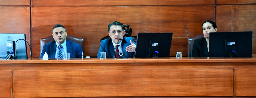 Al inicio de la actividad. las alumnas y alumnos del curso “Participación y Argumentación en Democracia” asistieron a dos alegatos realizados en la Segunda Sala del tribunal de alzada -integrada por los ministros Pedro Caro Romero, Michel González Carvajal y la abogada integrante Ximena Carmona Torres-, donde los miembros del tribunal explicaron el desarrollo de este tipo de audiencias y respondieron las dudas de los y las estudiantes.