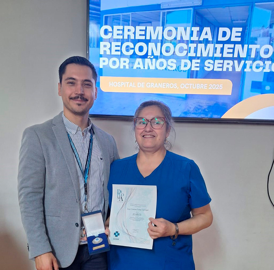 Graneros.- En el marco de la conmemoración del Día del Hospital, el Hospital de Graneros realizó una emotiva Ceremonia de Reconocimiento por Años de Servicio, instancia en la que se destacó la entrega, compromiso y vocación de quienes han dedicado gran parte de su vida laboral al fortalecimiento de la salud pública en la comuna.