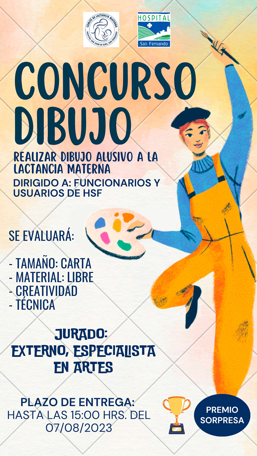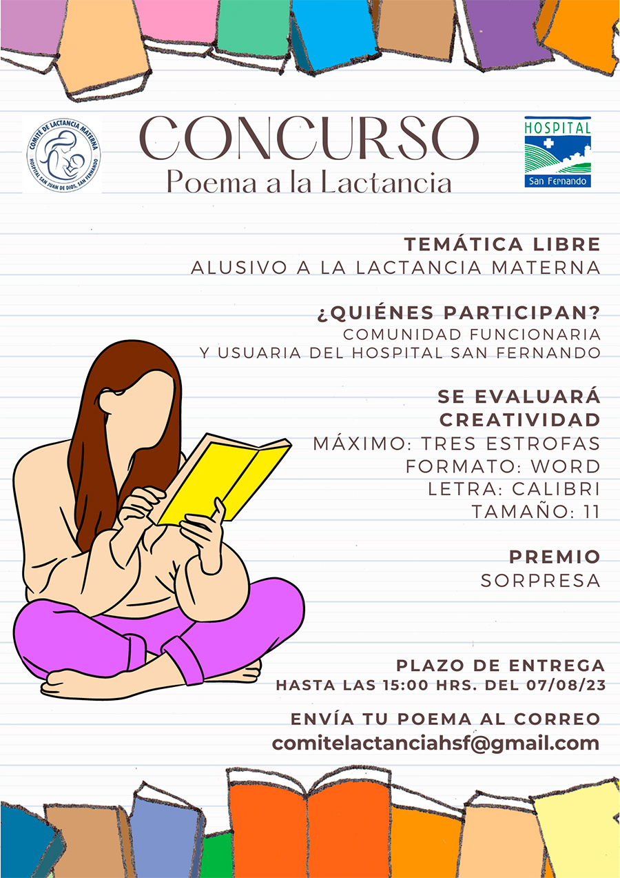 Concurso “Poema a la Lactancia”: temática libre, alusiva a la lactancia materna, dirigido a funcionarios y usuarios del Hospital San Fernando. Si desean participar, deben enviar tu poema al correo co****************@gm***.com donde se evaluará creatividad. Máximo tres estrofas, en formato documento Word, letra “calibri”, tamaño 11. Plazo de entrega: lunes 7 de agosto del presente a las 15:00 hrs.