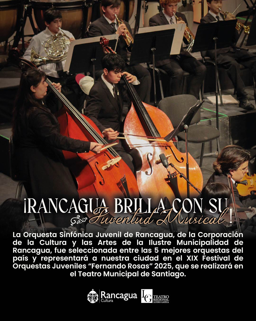 La Orquesta Sinfónica Juvenil de Rancagua (OSJR), elenco dependiente de la Corporación de la Cultura y las Artes de la Ilustre Municipalidad de Rancagua, se consolida como un referente del talento musical juvenil del país. Recientemente, el 25 de septiembre, la agrupación obtuvo un destacado promedio de 5,8, alcanzando el quinto lugar entre las diez orquestas seleccionadas a nivel nacional en la etapa de evaluación del XIX Festival de Orquestas Juveniles “Fernando Rosas” 2025.
