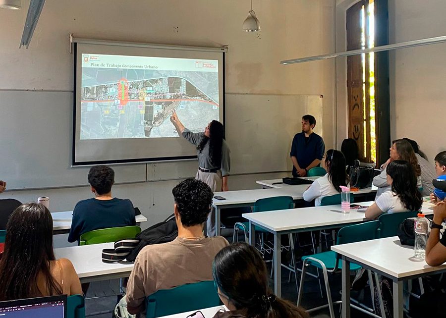 En ese marco, el pasado 1 de abril el equipo territorial del programa se trasladó hasta la FAU para presentar ante estudiantes los principales desafíos urbanos, sociales y territoriales del proceso que se desarrolla en Pelequén. La actividad marcó el inicio de un taller transversal en el que participan alumnos y alumnas de las carreras de Arquitectura, Diseño y Geografía, quienes tomarán a esta localidad como caso de estudio.