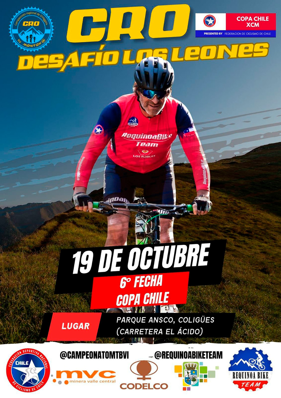 El próximo domingo 19 de octubre, Requínoa volverá a ser el epicentro del Mountain Bike nacional con una nueva edición del Desafío Los Leones, competencia que este año adquiere especial relevancia al ser sexta fecha del Campeonato Regional de MTB y, además, séptima fecha de la Copa Chile.